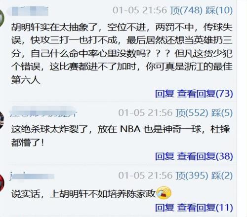 还有位球迷的长文点评说的特别真实且扎心:每次广东上半场、前三节领先对手十几二十分,之后上胡明轩就会被对手追上来;不管球队输赢,胡明轩的正负值几乎都是负的,广东基本领先大比分后上胡明轩,球队都是输分的,因为每球都是交给胡明轩为轴做进攻发起点,到最后时间走了大半,传球几乎毫无爆发力,还很随意,队友接球很不舒服,而且容易被断。
