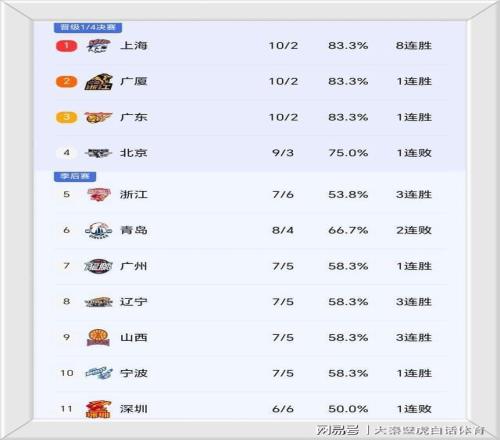①、本场大胜的浙江队先赛一场排名跻身前5;