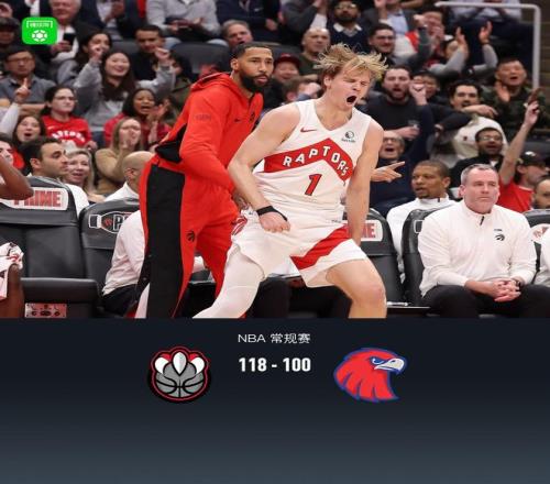 第四节猛龙RJ-巴雷特拿下12分,老鹰戴森-丹尼尔斯拿下8分,最终猛龙118-100战胜老鹰