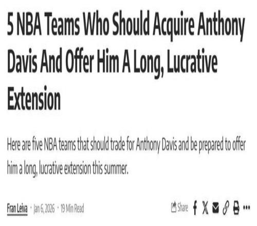 合同还剩3年1.75亿美元,浓眉哥被曝遭独行侠疯狂兜售!美媒《FW》晒出5大交易下家候选,其中勇士队位列第4。