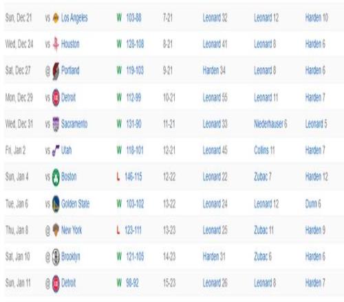 过去的11场比赛快船赢下了其中的9场,快船目前15胜23负距离西部第十的灰熊只差1个胜场,快船又燃起了附加赛的希望,而这一波11战9胜的基本盘就是哈登。