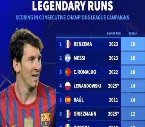 北京时间11月27日,德转统计出了欧冠历史连续最长赛季进球的10位球员,本泽马和梅西同以连续18个赛季欧冠进球排...