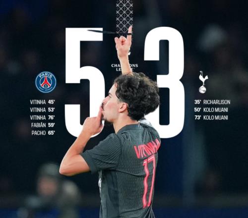 进球大战!巴黎53热刺维蒂尼亚戴帽卢卡斯肘击染红穆阿尼2射1传