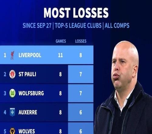 据德转统计,利物浦是自9月底以来五大联赛输球场次最多的球队,他们在11场比赛中输掉8场。自9月底以来五大联赛...